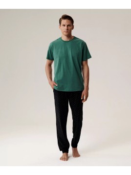 Piżama Męska NMP-388 ● gładka koszulka z krótkimi rękawami ● ma okrągły dekolt przy szyi ● spodnie z długimi nogawkami, wykończone u dołu ściągaczami ● spodnie pokryte wzorkami w pinezki lokalizacyjne ● luźny, komfortowy krój ● przewiewna bawełna - idealna do spania ● sznurek do regulacji w pasie oraz praktyczne kieszenie po bokach ● efekt brzoskwini (peach effect), co oznacza, że dzianinę pokrywają delikatne mikrowłoski ● trwała w użytkowaniu dzianina zapewnia maksymalny komfort użytkowania